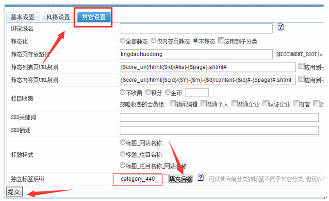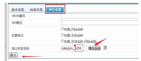 点击其他设置,点击填充后缀,会产生一个和栏目ID相同的数字(独一无二的);如果想改为和其他相同后缀,就改下那个比如440的数字,然后点击提交即可。